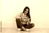Beautiful young woman writing a text on her mobile phone while sitting cross-legged, isolated white brick wall background. One single person. Communication, sms.