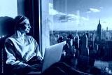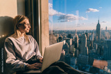 Young freelancer with laptop technology sitting at panoramic windowsill and enjoying beautiful above view of Manhattan district, millennial female with netbook working remotely in New York