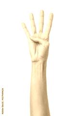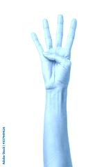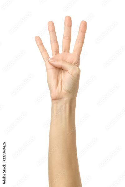 Number four. Woman hand gesturing isolated on white