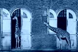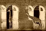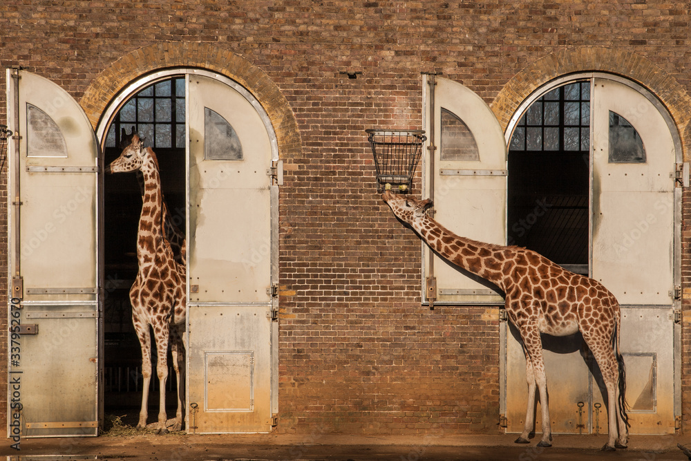 London, United Kingdon - A pair of Giraffes on brick wall background at London Zoo. The area is publicly accessible - no property release is required.
