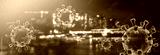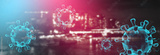 Covid-19, night city, neon lights, dark empty streets, abstraction background with elements of the virus. The epidemic of viral diseases. Micro organisms, macro. Pandemic, social environment.