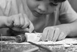 Children having fun with archaeology excavation kit. Boy plays an archaeologist excavated, training for dig fossil