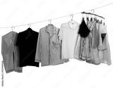 washed shirts and towels with coat hangers hanging to dry on clothesline, isolated on white