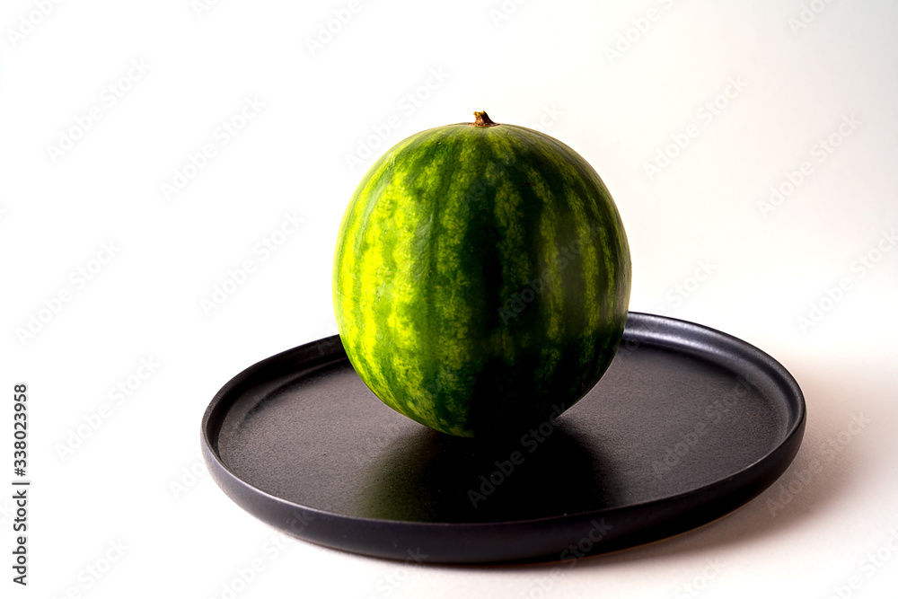 Front view fresh juicy Watermelon on black plate background isolated on white and copy space for text.
