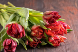 Spring tulip flowers bouquet over brown wooden background. Flat lay, copy space.