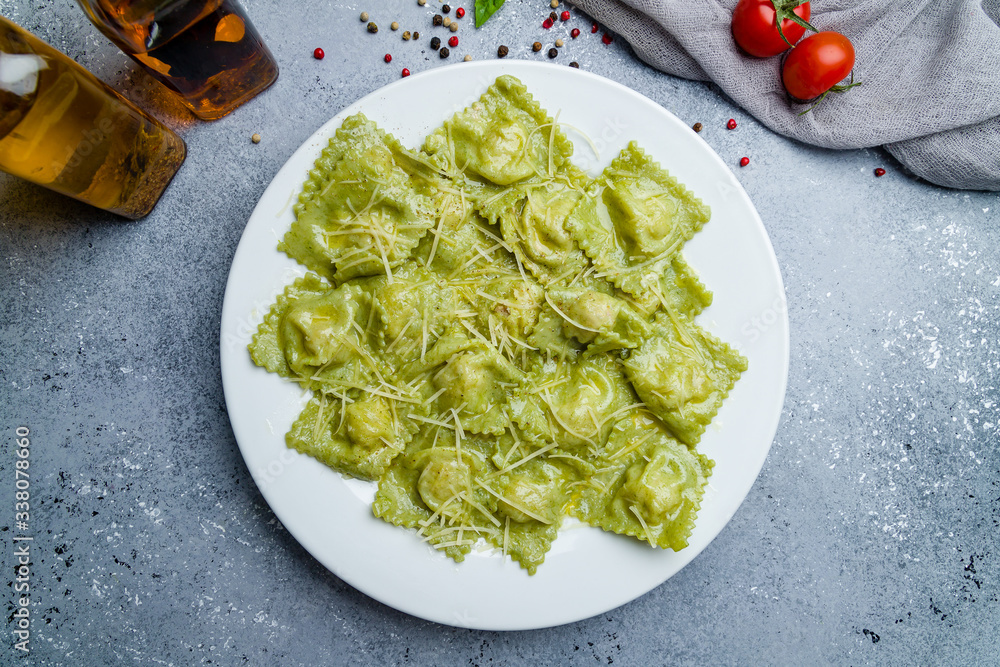 Green ravioli with spinach on white plate