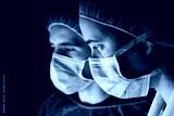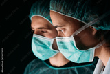 Close of two side female and male doctors working wearing medical surgical mask, medical cap and virus protective clothing on black background with copy space. COVID-19 The coronavirus pandemic.