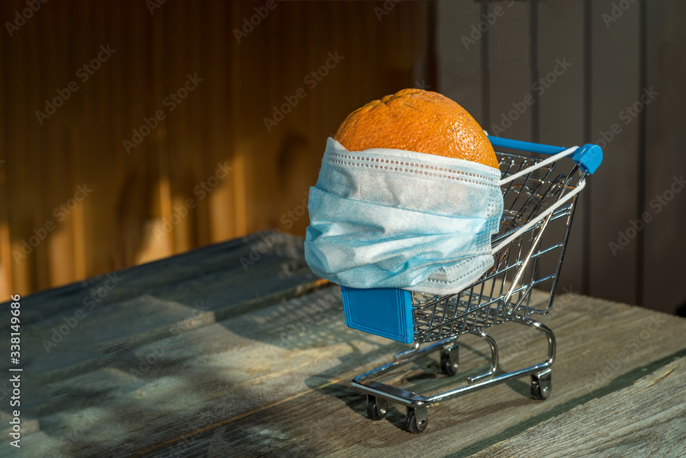Fresh juicy orange fruit in trolley shopping ,copy space for text. Coronavirus isolation. Pandemia.