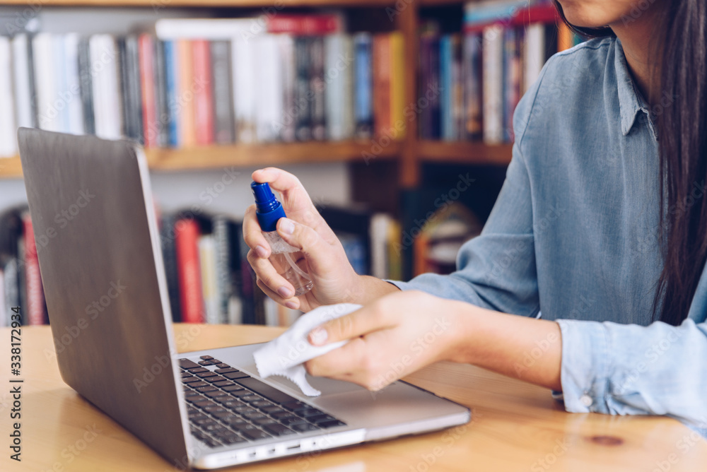 Coronavirus concept. Girl working from home spray antiseptic on monitors laptop. Global call to stay home.