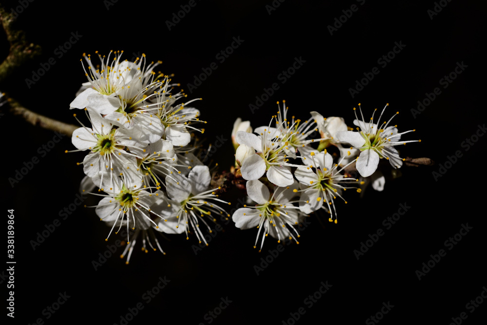 A branch with small white flowers protrudes laterally into the picture against a dark background