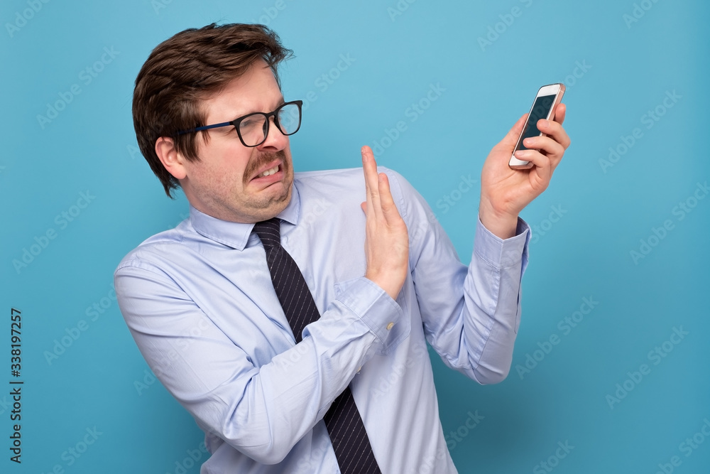 Frustrated mature man in shirt and tie holding mobile phone trying to avoid serious call