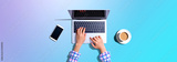 Woman using a laptop computer with a phone and a cup of coffee