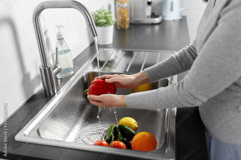 hygiene, health care and safety concept - close up of woman washing fruits and vegetables in kitchen at home