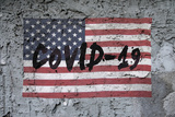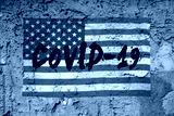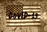 On the textured concrete wall with the American flag, the inscription : COVID-19. Concept: coronavirus and pandemic, natural disaster in the country.