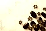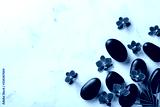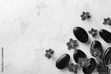Spa composition with flowers, green leaves and massage stone on white background top view. Beauty treatment and relaxation concept. Flat lay. .
