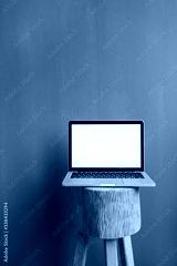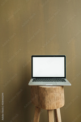 Blank screen laptop on olive background. Front view social media, website, blog hero header template.