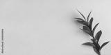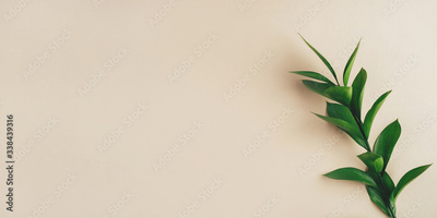 Fresh green branch on a beige background. Minimal concept. Flat lay, copy space.