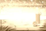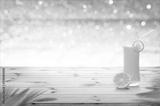 Beautiful Summer background woodent table top and blur sea sandy beach view with green plam leaves as frame