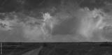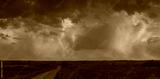 Path to cumulonimbus red storm clouds at sunset, beautiful landscape