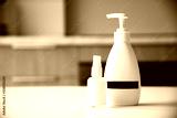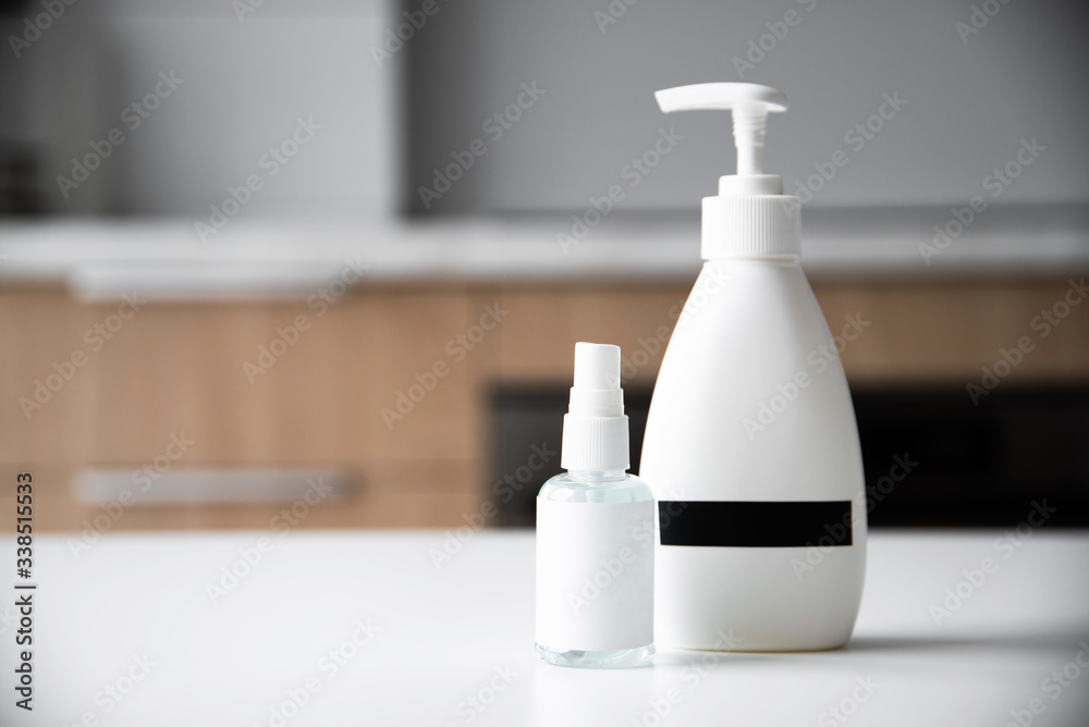 Health care hygiene protection prevention against virus, bacteria, flu and coronavirus by disinfection hands with alcohol sanitizer. Soap and antiseptic gel bottle close up