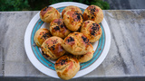 A plate of typical Turkish oven product pastry as known pogaca. Close up of traditional Turkish pastry. Freshly baked, homemade hot pastries. Nutrition and eating concept. Fattening food and obesity.