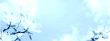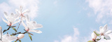Delightful blooming white magnolia flowers against the clouds sky. Fantasy spring background.
