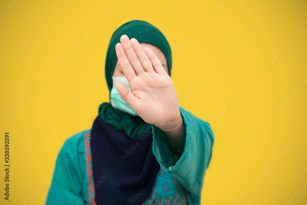 Muslim girl wearing surgical mask for protection. Hijab woman take a mask. muslim girl wearing mask for