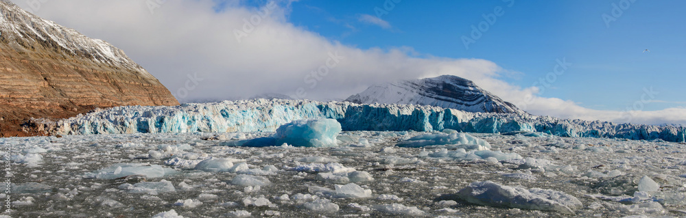 Landscape with glacier in Svalbard at summer time. Sunny weather.