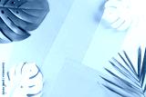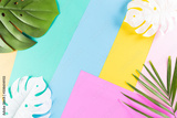 Summer tropical colorful background with palm and monstera leaves. Minimal fashion with a space for text summer concept. Flat lay.