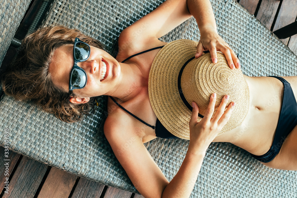 Top view of beautiful young woman relaxing in deck chair near the pool