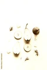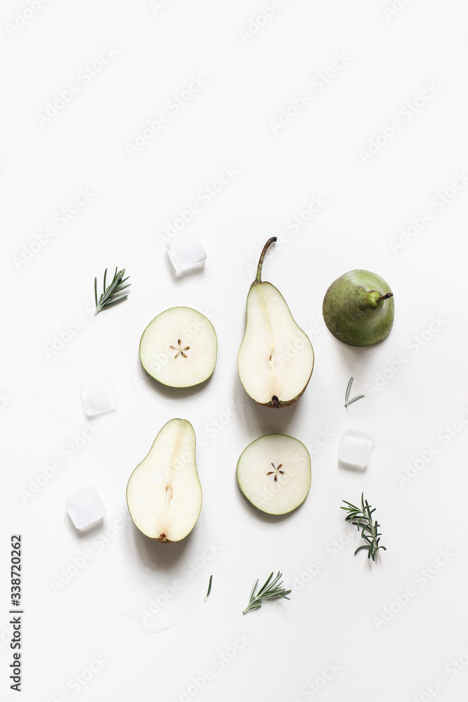 Green whole and sliced pear fruit, melting ice cubes and rosemary herbs leaves, branches isolated on white table background. Summer refreshment concept. Flat lay, top view, vertical. Empty copy space