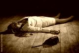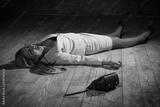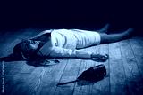 Crime scene with strangled pretty business woman lying on the floor