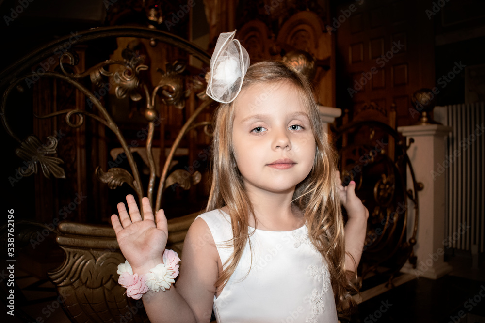 Baptism, wedding ceremony and fashion. Portrait of cute little girl with blasé expression on her face.