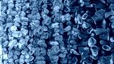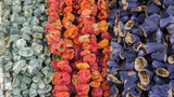 Hanged delicious colorful and sun dried marinated Turkish tomatoes, peppers and eggplants or aubergines in the traditional bazaar at Gaziantep City, Turkey. Dried tomatoes texture pattern background.