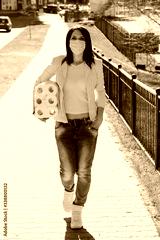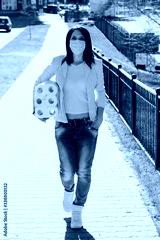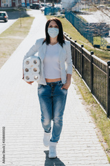 Woman walking in medical mask with toilet paper during coronavirus outbreak or covid-19. concept of covid-2019 quarantine. dangerous COVID virus, people panic