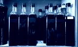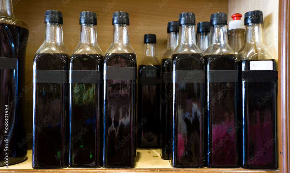 Pomegranate Syrup / Jam (Nar Eksisi) bottles on wooden market shelf. Traditional Turkish cuisine culture food sauce / ingredient.