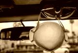 Face mask clipped with sunglasses on visor of interior of a car in a shooping center parking lot during the Coronavirus pandemic