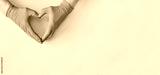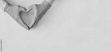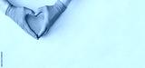 Hands in blue medical gloves showing shape of heart on yellow background. Top view. Copy space