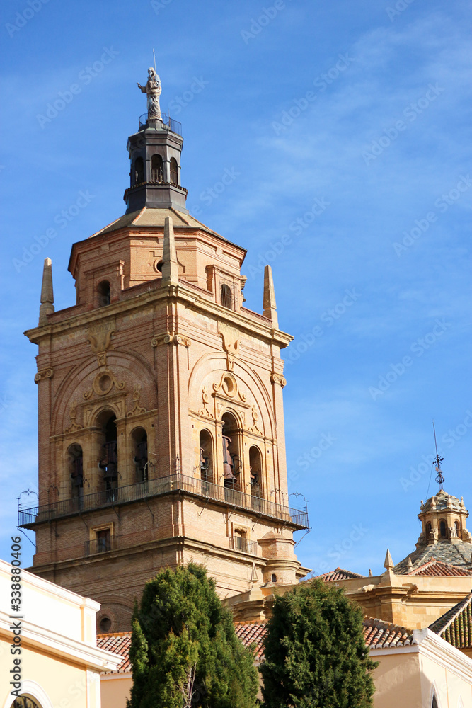 Bell tower of Guadix cathedral of the Incarnation, Granada, Spain surrounded by green trees