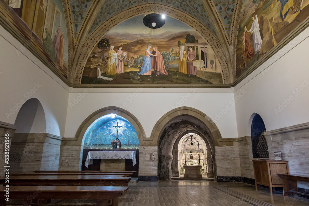 Ein Karem, Jerusalem, Israel, January 29, 2020: Fresco depicting the meeting of Mary with Elizabeth at the Sanctuary of the Visitation in En Kerem