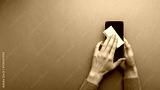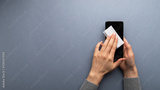 Title: Health care hygiene protection, prevention against virus, bacteria, flu and coronavirus, covid - 19 by disinfection of smartphone with antiseptic wipe