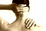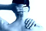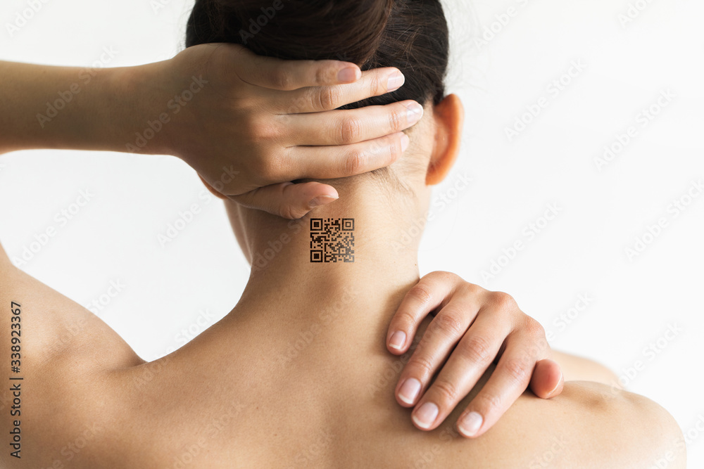 Person with QR code on neck. Future technology of chipization people for observation in coronavirus social crisis time. Restriction of freedom.