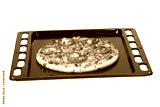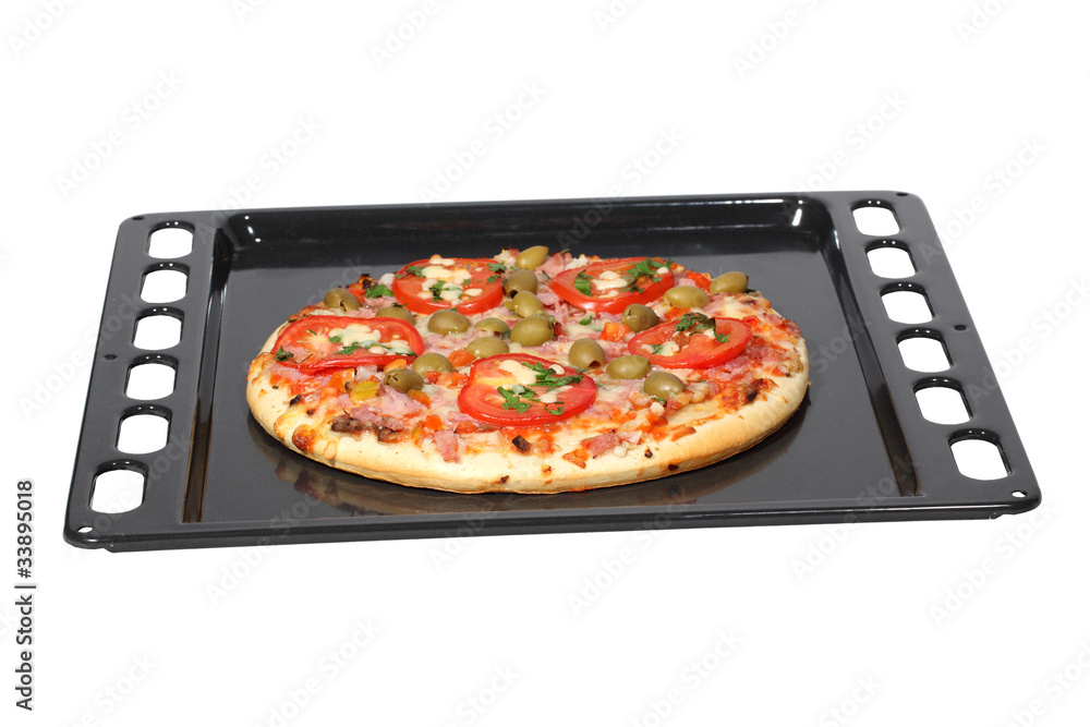 Fresh pizza on a metal baking tray isolated on white