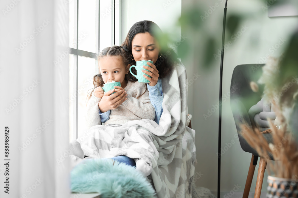 Woman and her little daughter with tasty cocoa drink near window at home