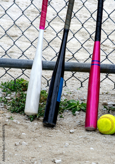 Baseball bats and a softball, Tools for a girls baseball game