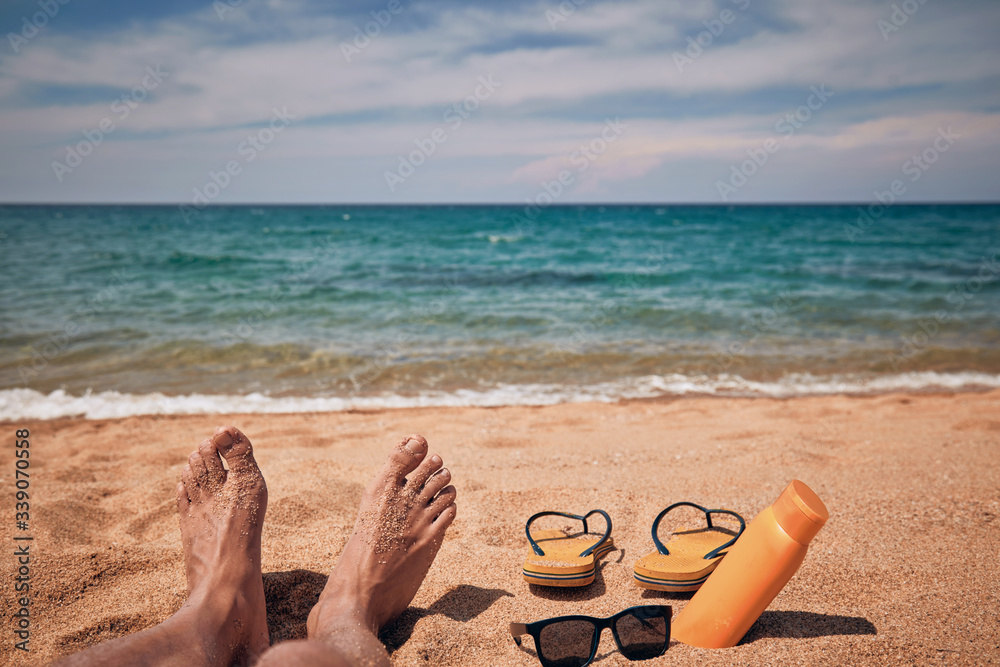 Man lying and enjoying on a sandy tropical beach.