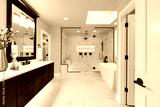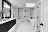 Luxury modern home bathroom interior with dark brown cabinets, white marble, walk in shower, free standing tub.