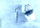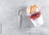 Yogurt with granola flakes and fruits in a plastic cup to go