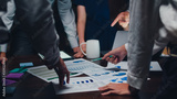 Millennial Asia businessmen and businesswomen meeting brainstorming ideas about new paperwork project colleagues working together planning success strategy enjoy teamwork in small modern night office.