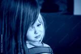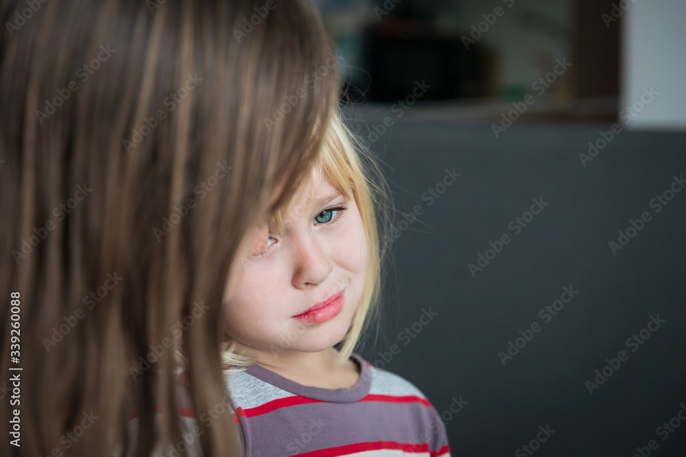 sad little girl talk with mother at home, family staying home